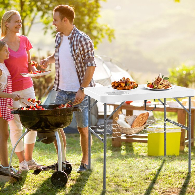 4.Easy to Store and Transport: The quick-folding design with safety latch allows you to effortlessly carry or store the folded table which measures only 40" x 26" x 5" (L x W x H). Plus, the telescoping drain pipes can be extended from 13" to 33.5" as you need.
