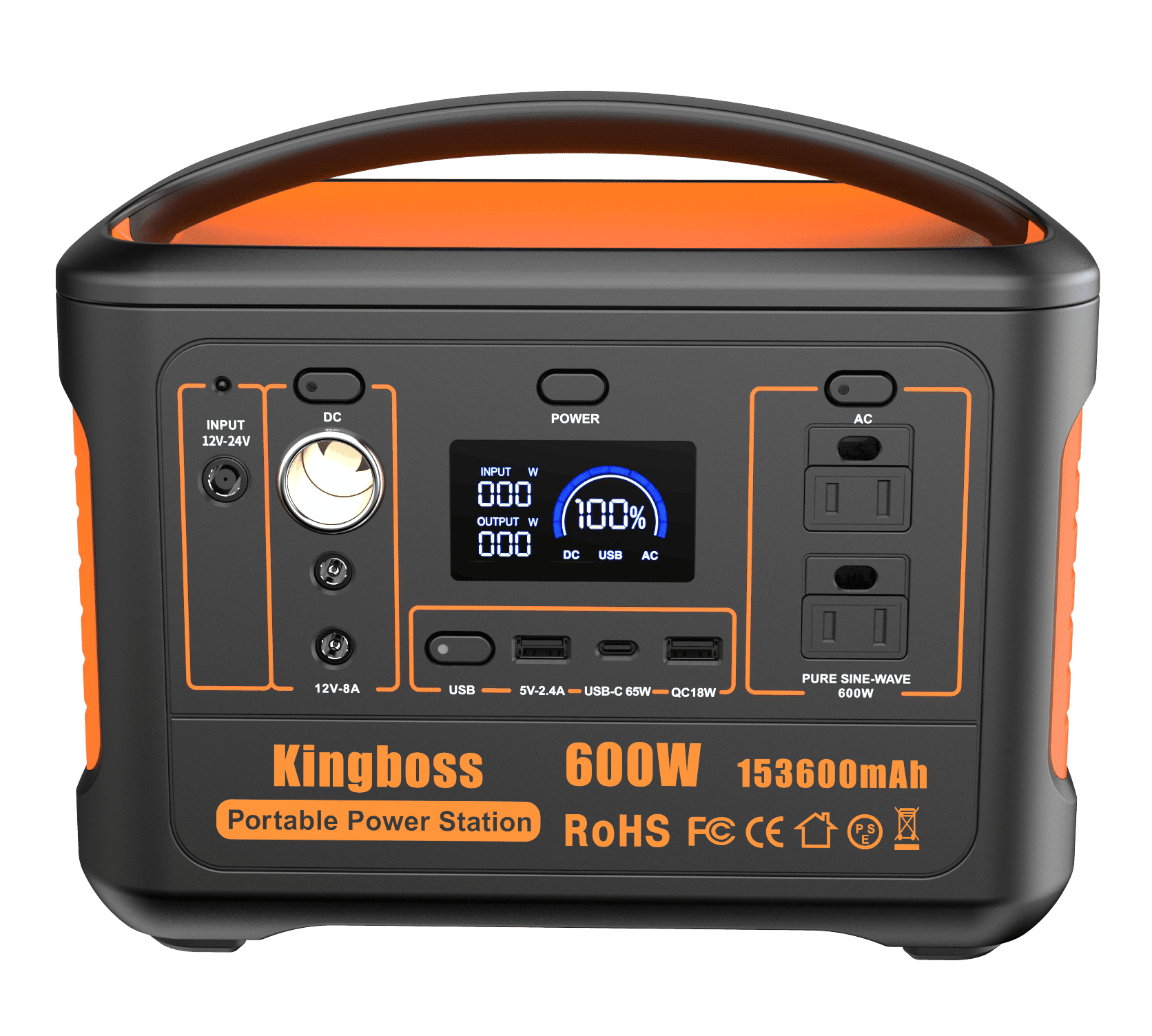 [MULTIPLE OUTPUT PORTS]: Kingboss Portable Power Station is featured with AC/DC/USB outputs: 2*110V AC output (600W); QC 3.0 USB port; 1*USB port (5V-2.4A); 1*USB-C PD65W; 1*DC input with 1*DC input (12V- 24V).[DEVICES]: Our Portable Power Station can charge devices such as: Computer; Jump Starter; Mini Projector; Fan; Mini Fridge; Printer; Drone; Phones/Tablet; Powertool; Laptop/TV. Only Devices up to 600W can be charged.[INCLUDES]: Kingboss Electric Generator includes 600W outdoor and indoor power supply; Car charger; AC power adapter; USB-C Cable + Kingboss Travel Carrying Case. Our 600W Power Station is perfect to be transported due to its weight (11Ibs) and size (7.70x5.20x9.10in).[RECHARGING METHODS]: Our Battery Powered Outlet can be recharged: With a compatible 100W solar photovoltaic panel (8 hours); With our car charger (12 hours); With AC Wall Outlet (6.5 hours). Lithium Battery 1000W recharges faster than other batteries.[PROTECTION]: Kingboss Battery Generator is equipped with an advanced BMS (Battery Management System) Multiple Outlet that protects the battery and devices against short circuits; over-temperature; overcharging; overvoltage and overpowering.[SAFETY]: Our power bank includes a Pure Sine Wave AC output that ensures stable and safer charging; and reduces audible and electrical noise. On top of that; it contains an MPPT controller built-in for optimized high-efficiency solar charging.[RELIABLE]: To give customers a pleasant experience; Kingboss offers a 2 Year Warranty that allows you to return the portable generator by 7 days in case it is defective; and a 24/7 customer service. Camping outdoor awaits you with our Solar Generator!