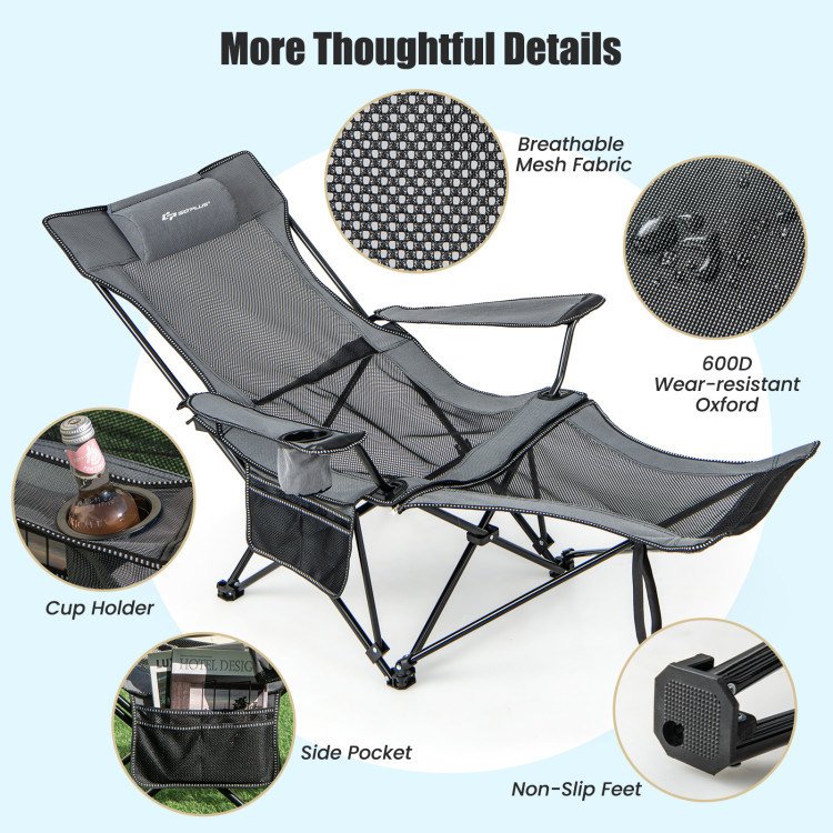 1.2 in 1 Camping Lounge Chair: Featuring a detachable footrest design, this camping lounge serves as both a recliner and a chair, providing you with different seating options for any outdoor activity. Just unzip the zippered and pull up the bottom feet, the footrest will be easily removed.