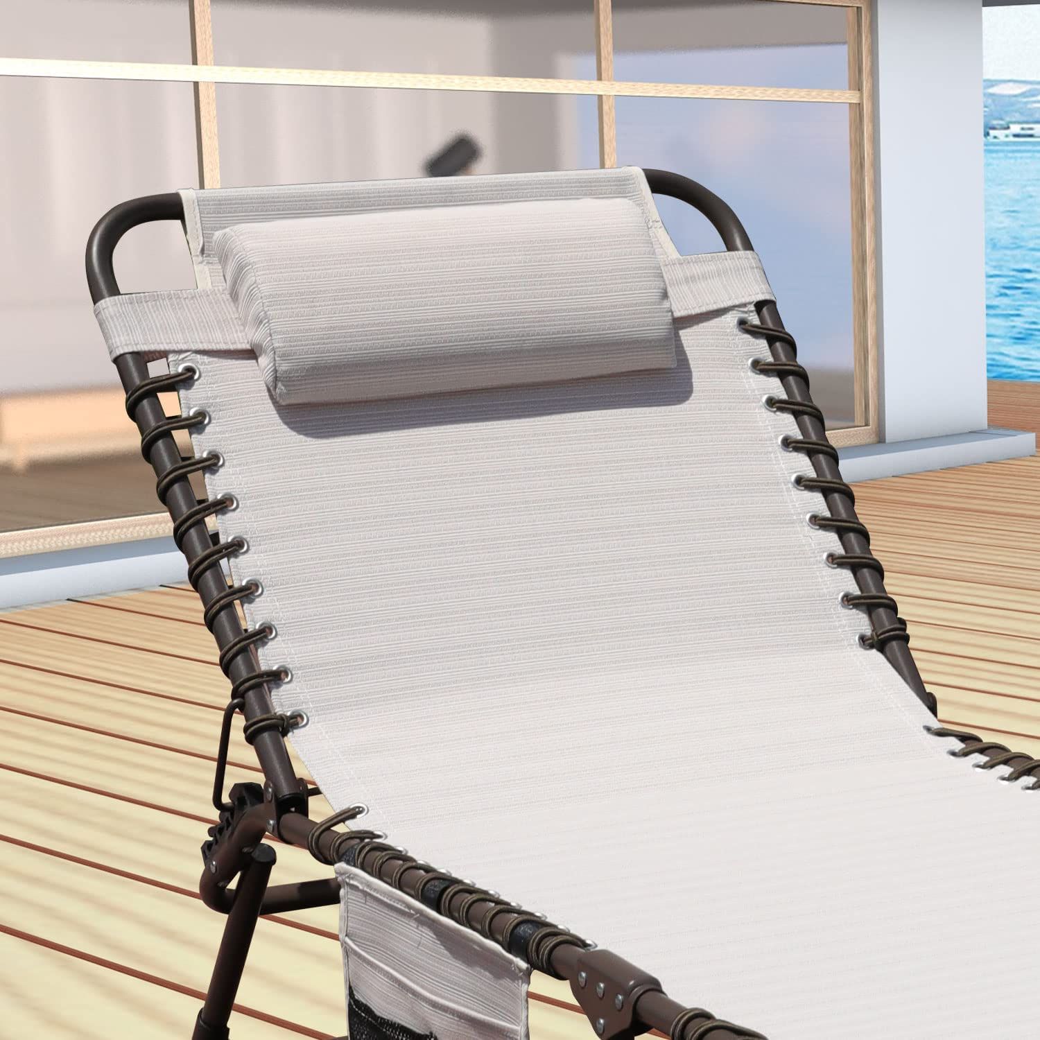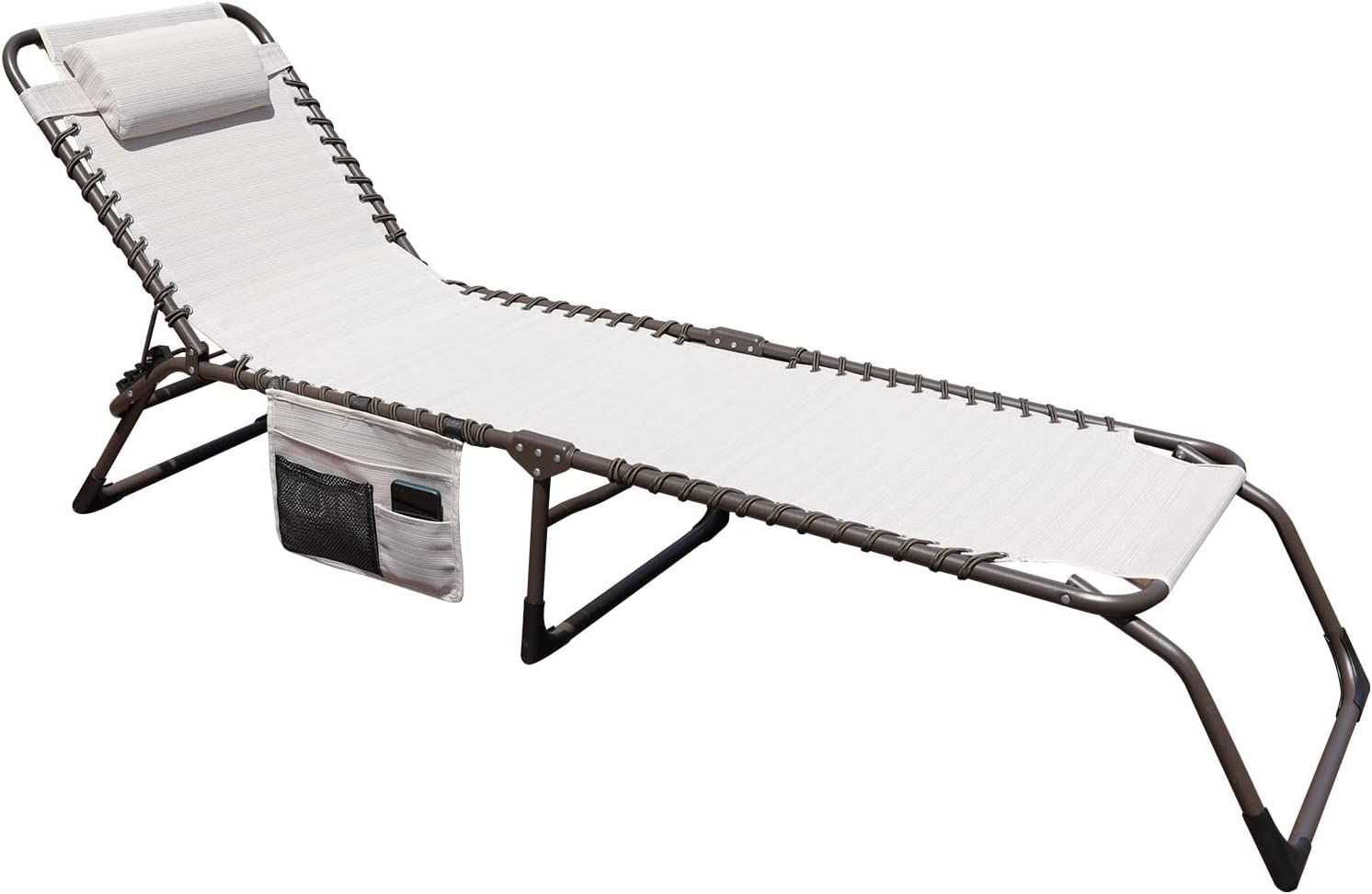 Seat and back suspended by double bungee suspension system provides more comfort and durability, Supports up to 250lbs weight capacity. Folding lounge chair upgraded with sturdy steel frame and Breathable Textilene fabric for longevity,and each lounge designed with a Side Pocket,Great for storing your Phone,Pad, water bottle,Magzines, books & More.The ergonomic design and waterproof Textilene mesh seat provide maximum comfort, And 3 reclining position for sitting, reclining and lying down.Removable padded pillow for both headrest and lumbar support ,This sunbathing chaise lounge is suitable for everyone. Great for camping,swimming poolside,beach,Patio and garden.Easy Storage and Carrying: Our chaise lounge chair possesses a quick folding design,No Assembly Required, which is convenient to carry and store. You can easily put it into the trunk of the car or carry it directly by hand.