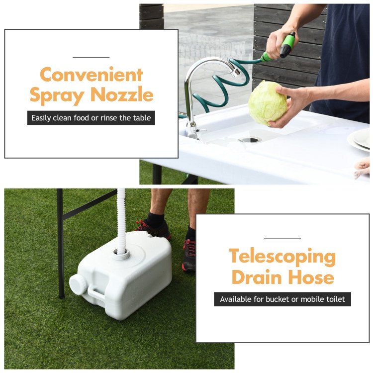 The quick-connect faucet is simple to set up and attach to a garden hose, & the extending sprayer gives you water pressure where you need it. With a durable sloped surface and integrated sink with drain, this table gives you the convenience of your kitchen in the great outdoors. The folding legs allow you to take this table anywhere.