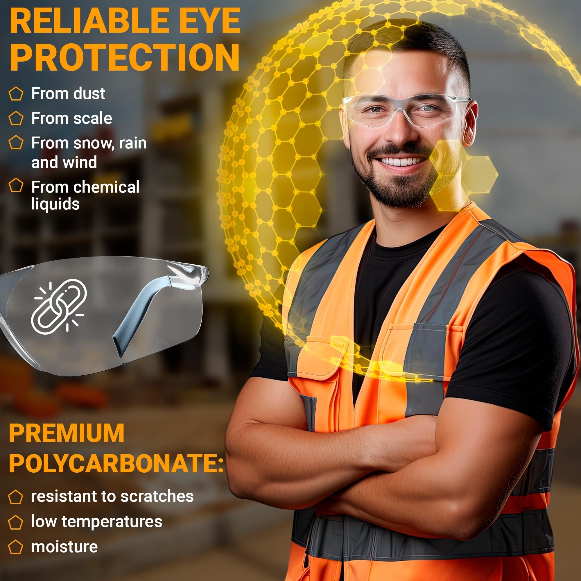 2.Ultimate Comfort and Stability. Say goodbye to readjustments! Protective eyewear stays put whether you're cycling, running, or working outside. Tailored to perfection, work glasses are adjustable, won't slip down, and can be worn for long hours.