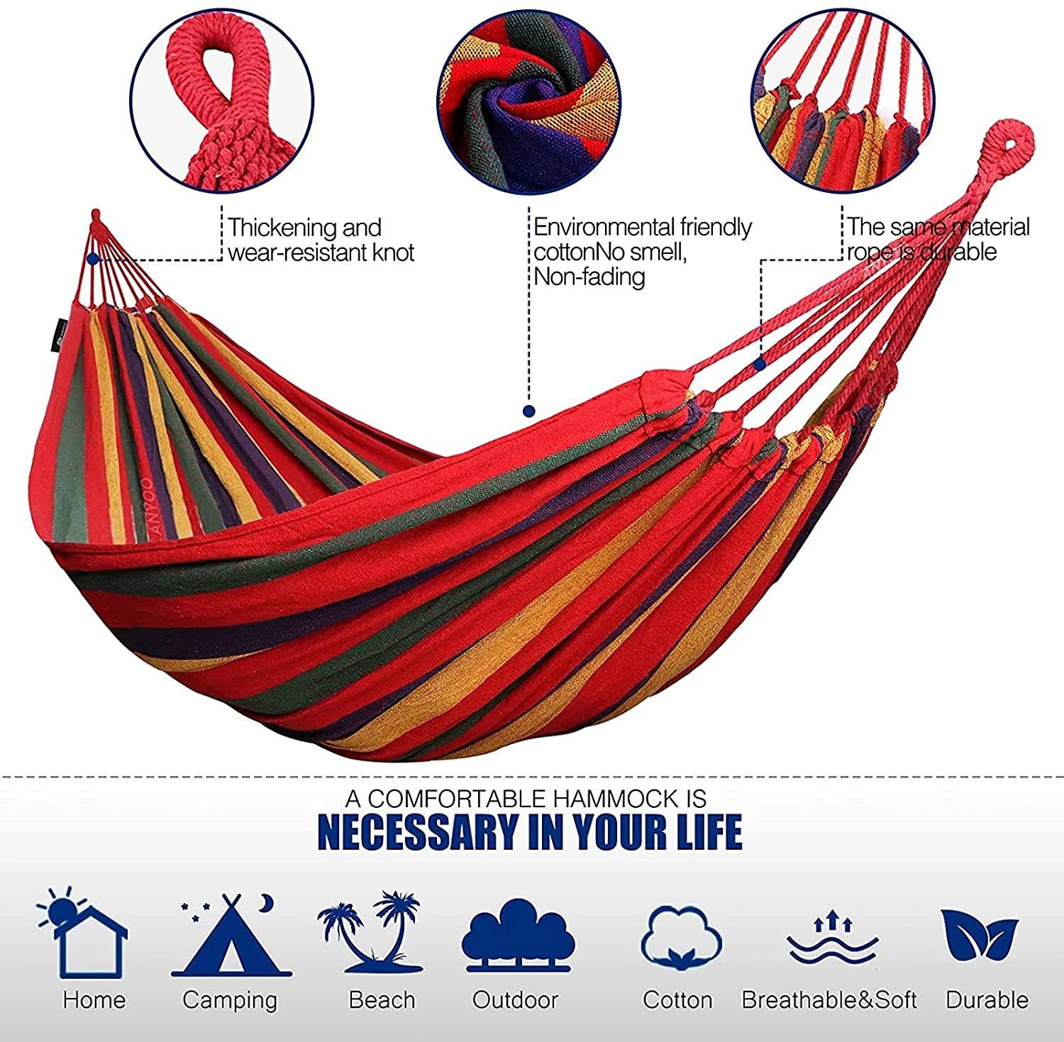 1.Comfortable Material: The tightly-woven fabric provides a supportive and comfortable sleeping surface, and the hammock conforms to your body shape to reduce pressure points and provide maximum relaxation.