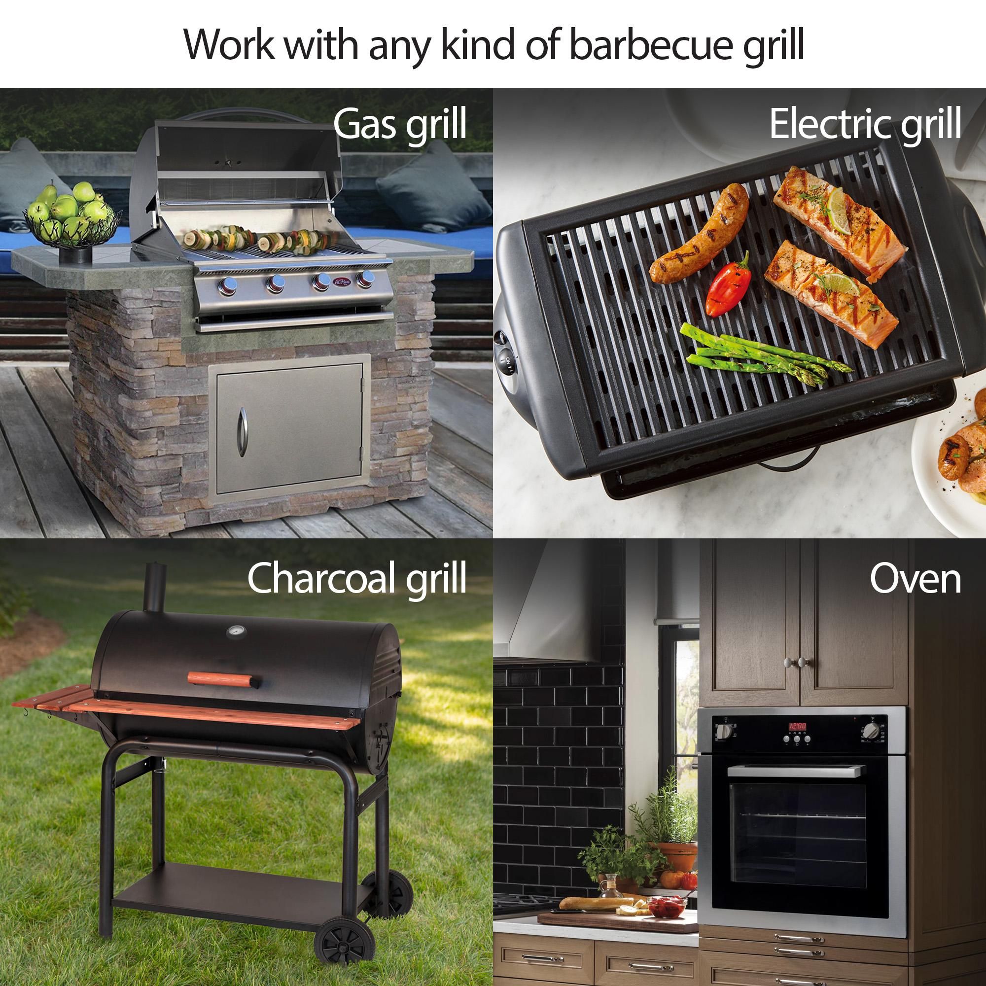 1.5 pcs grill mats can be used for different types of barbecue grills. it's size is 33 cm x 40 cm (15 in × 13 in). this is enough for cooking all kinds of food: chicken, eggs, ribs, fish, vegetables, steaks, burgers, kabobs, shrimp, bacon, grilled cheese sandwich and more. never worry about: food burning food sticking to the grill flare-ups again you can also cut them into any size or shape to suit any needs. healthy and safe materials grill mats are made from pfoa-free materials and premium