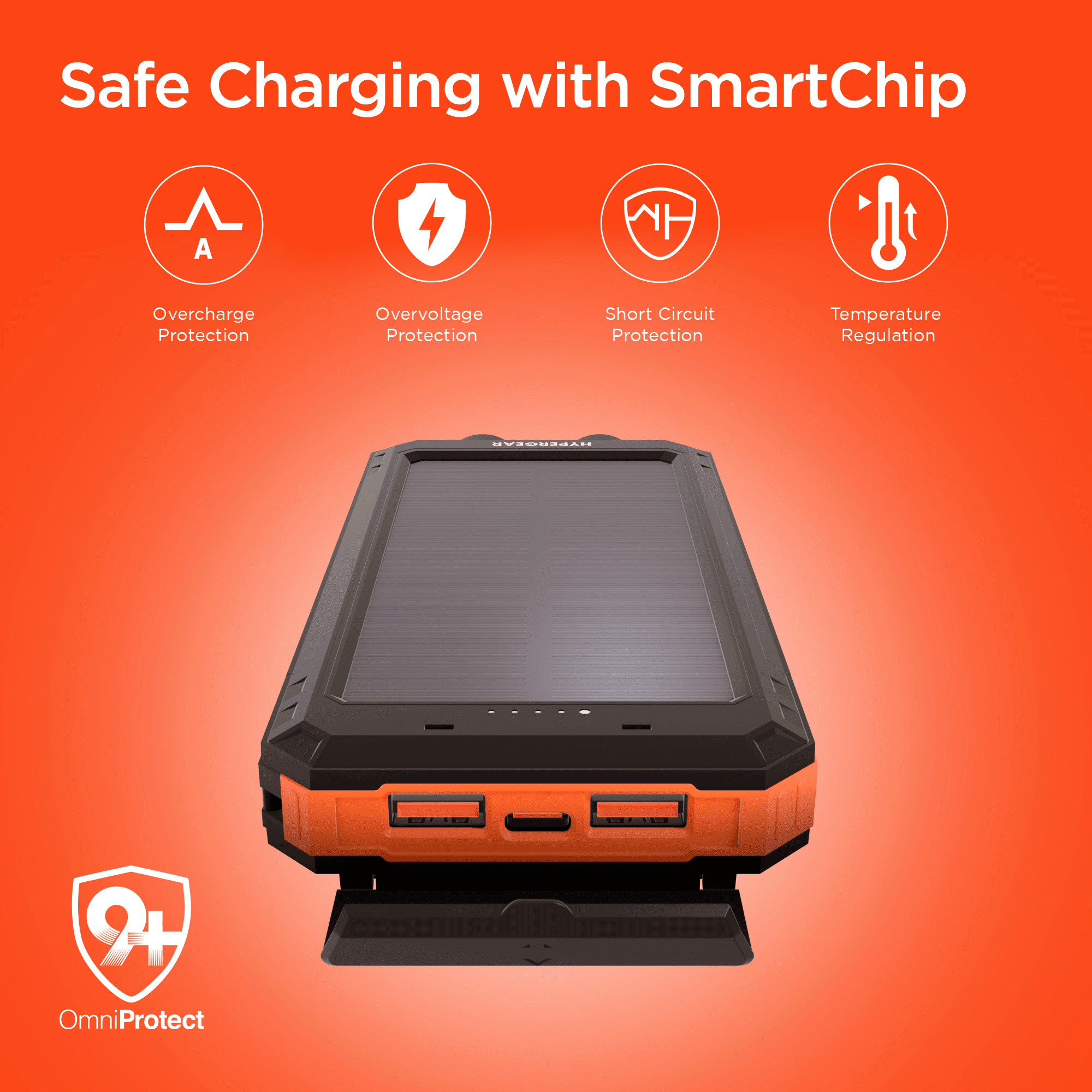 Reliable high-speed power – wherever you wander. Part of the Rugged Weatherproof Series from HyperGear, the SolPro 10K Fast Charge Solar Power Bank features a 10,000mAh capacity and 3 high-speed charging ports, including a 20W USB-C Power Delivery port that can fast charge any iPhone or Android phone from 0 to 50% in just 30 minutes! Designed for the outdoors with a certified IPX5 water-resistant body, this tough-built power bank also features an integrated compass, an LED flashlight with strobe and SOS modes, and a solar panel surface for emergency recharging when you’re totally off the grid. Whether you’re heading to a campground, to the beach, or to a new hiking trail, you need reliable power to stay connected – and this is the ultimate backup power source for all your adventures.