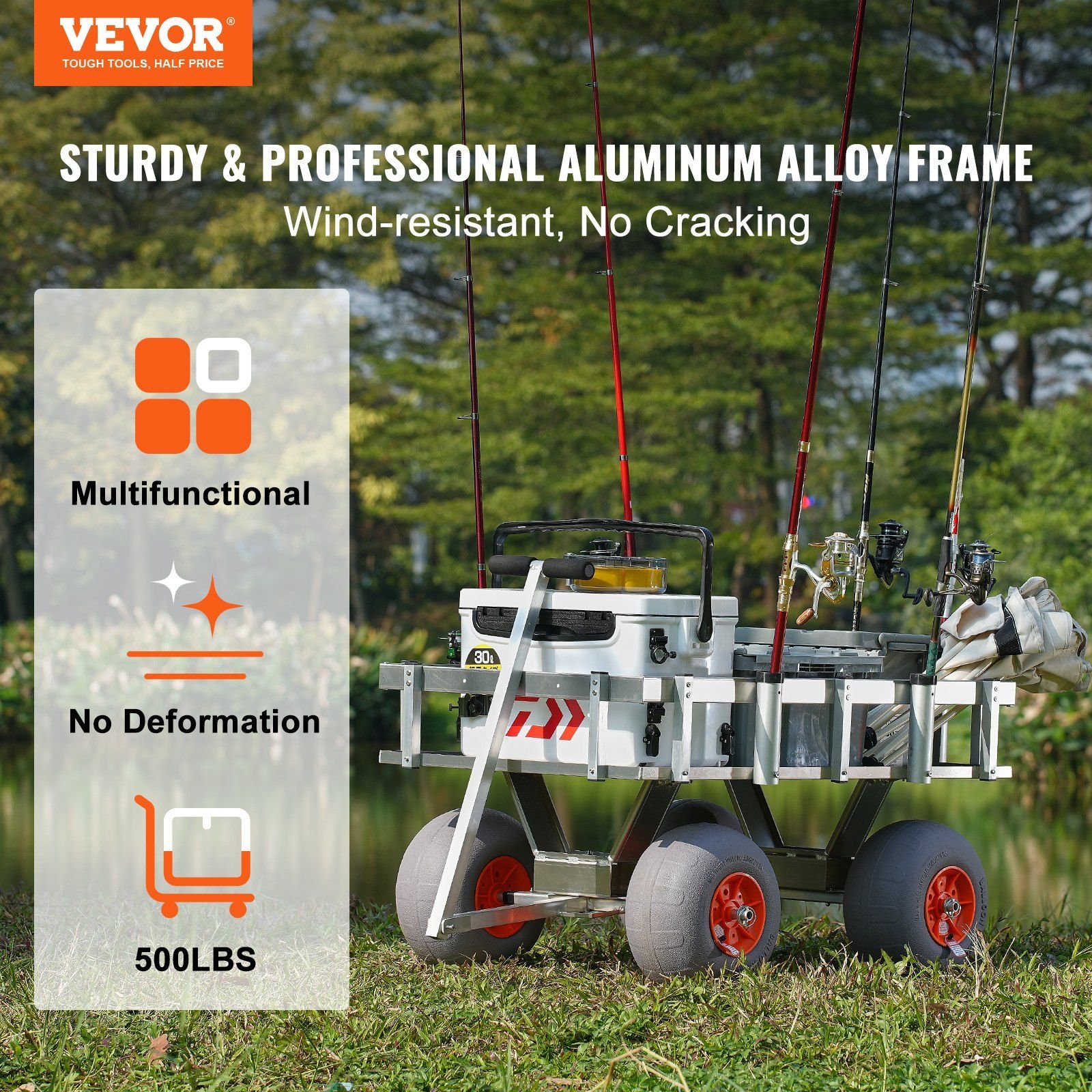 1.Sturdy Frame: Meet the VEVOR beach fishing cart, crafted with high-grade aluminum for a frame that's not just tough but also rust-resistant. It's like having a reliable fishing buddy who never lets you down. Plus, it's lightweight – so you can focus on the catch, not the carry!