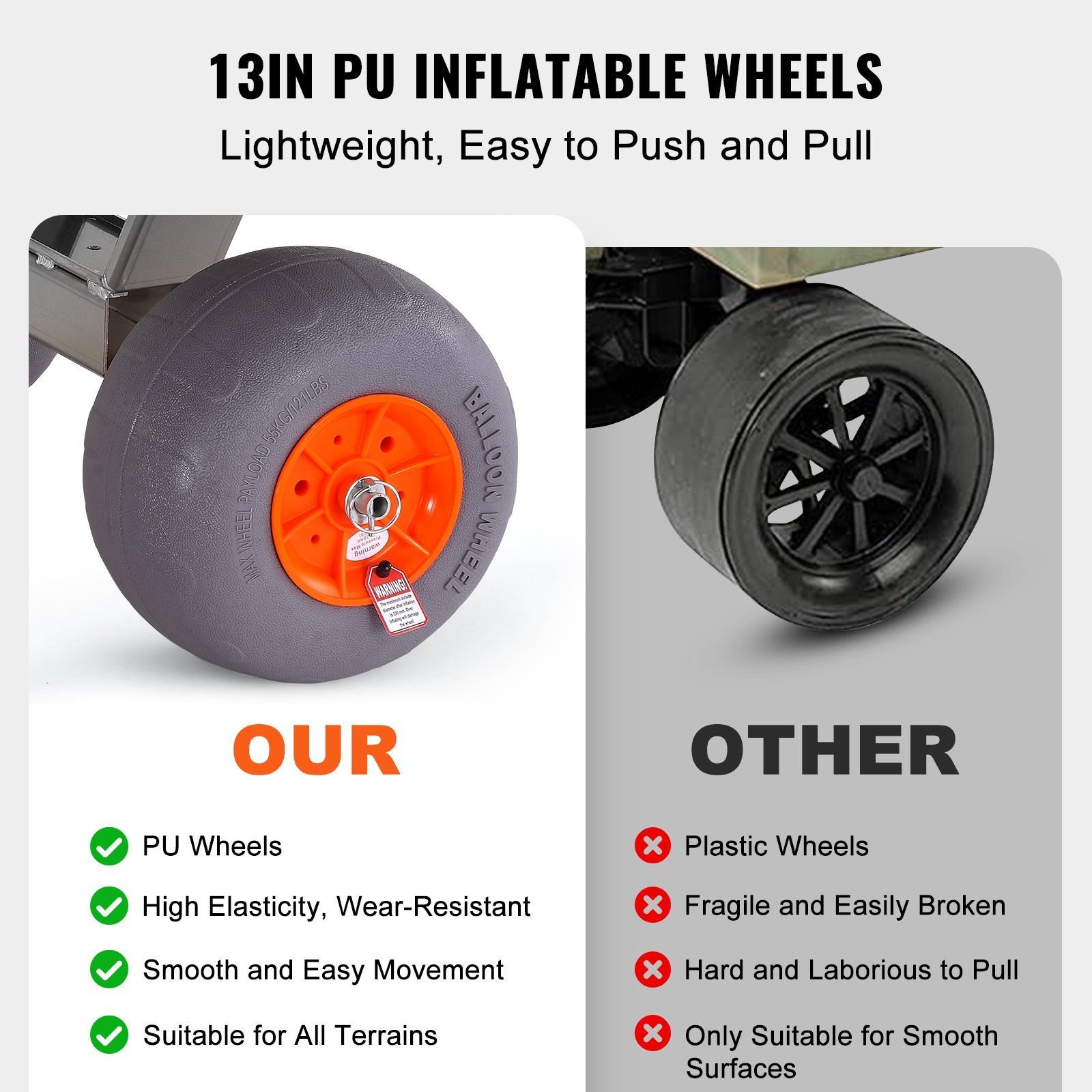 2.Practical PU Wheels: This fishing beach cart is outfitted with 13-inch PU inflatable wheels that glide over sand, mud, gravel, and grass like a dream. These wheels don't just carry your load; they make your journey to the perfect fishing spot as smooth as your favorite fishing line.