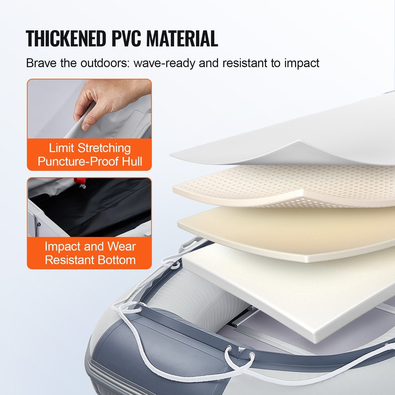 Upgraded thick PVC material, coupled with aluminum benches and marine wood bottom floor, prevents sagging and instability, ensuring the inflatable boat's longevity in marine conditions. Independent 4 air chambers enhance safety, maintaining buoyancy even if one chamber is compromised.