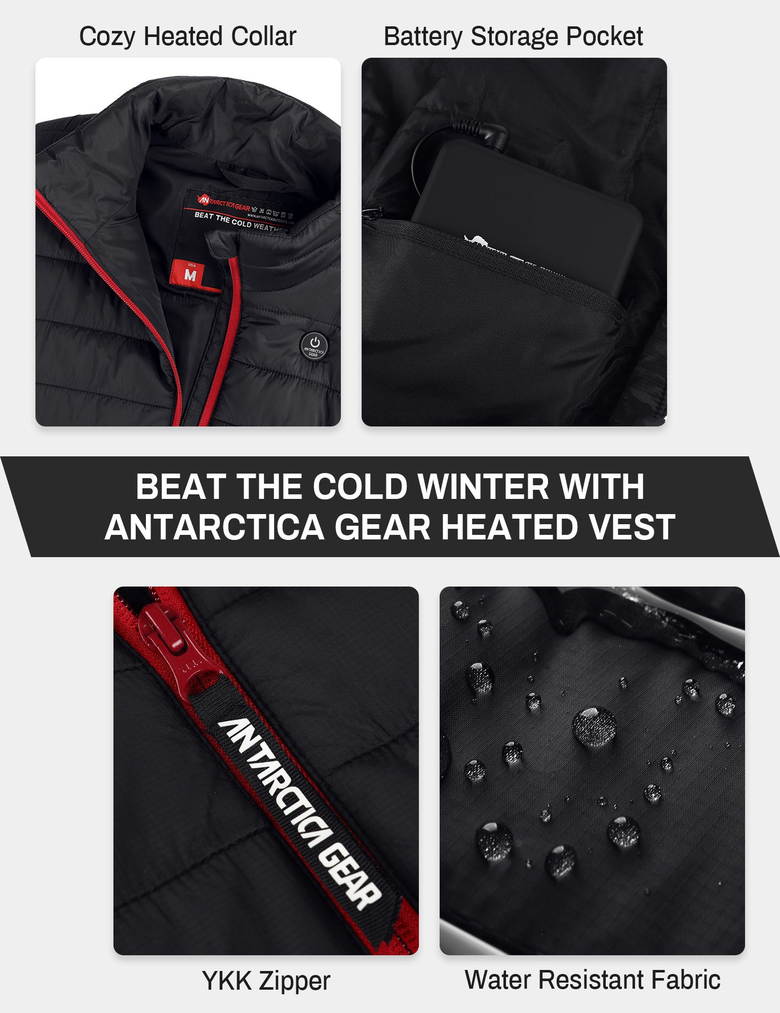 ��CARBON FIBER HEATIING ELEMENTS:Four carbon fiber heating elements are located on the chest, back and neck and are highly effective to give you the heat you need straight to the core. Perfect as a mid-layer, the ANTARCTICAGEAR heated vest is an ideal addition as a layering option for evolving winter conditions.
